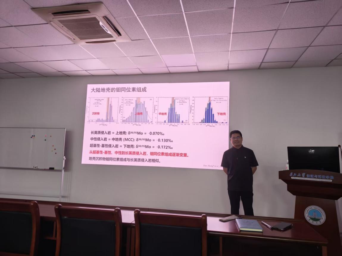 (通讯员 雷鸣)2026年4月13日,应古天乐代言太阳集团网址郭锋教授和雷鸣特任教授的邀请,中国地质大学(北京)地球科学与资源学院黄丰教授来院做了题目为“’钼’击弧岩浆成因和陆壳组成”的学术汇报。 黄丰教授首先从钼元素的基本化学性质出发,介绍了钼在岩浆演化过程中的赋存形式和变价特征,确定了它是一个氧化还原敏感的不相容元素。通过总结已有的关于地幔和地壳来源的岩石的钼元素和同位素组成的对比,确定了亏损地幔具有异常低的钼元素含量和较轻的钼同位素组成,对大陆地壳的钼同位素组成的研究仅限于大陆上地壳,已有研究揭示了大陆地壳很可能具有重于亏损地幔的钼同位素组成。鉴于大陆地壳和亏损地幔之间钼同位素组成的极大差异,提出了两个核心科学问题:(1)硅酸盐地球(包括地幔和地壳)的钼同位素组成是如何达到平衡的?和(2)大陆中下地壳和全大陆地壳的钼同位素组成到底如何? 针对第一个科学问题,黄丰教授选择了位于青藏高原中部形成于典型大洋俯冲期间的高镁安山岩开展研究,揭示了它们具有极轻的钼同位素组成。这些高镁安山岩具有与周边同时代沉积物一致的Sr-Nd同位素组成,结合它们类似沉积物熔体交代地幔楔形成的典型高镁安山岩的微量元素特征,确定了这些极轻的钼同位素组成来自俯冲沉积物。因此,俯冲的大洋沉积物很可能交代地幔楔形成轻钼同位素储库。进一步对跨越万里的特提斯域来自岩石圈地幔的超钾质岩石的研究也揭示了它们具有轻于亏损地幔的钼同位素组成,确定了特提斯域大陆岩石圈地幔很是轻钼同位素储库,可以在一定程度上平衡大陆地壳的重钼同位素组成。 针对第二个科学问题,通过对青藏高原南部冈底斯弧剖面岩浆岩组成与大陆地壳物质的地球物理性质和化学组成对比,确定了冈底斯弧不同岩性组成的侵入岩能够代表不同深度的大陆地壳物质组成。在确定基性、中性和酸性岩石分别代表大陆下、中和上地壳的研究方案后,进一步搜集和整理全球已发表的显生宙侵入岩,系统厘定了大陆下、中和上地壳的钼同位素组成。结合大陆地壳不同的结构模式,首次给出了大陆地壳的钼同位素组成的推荐值。结合全球尺度的壳幔分异和演化模型,确定了现今的壳幔分异过程可能达到了动态平衡。 汇报结束后,参与报告的师生踊跃提问,针对钼同位素在地壳的组成和壳幔分异过程的应用上进行了深入讨论,对钼同位素的其他可能的应用方向(如矿床学研究,示踪大陆俯冲过程)开展了细致分析,为进一步了解钼同位素在地球科学研究中的应用打下了基础。(审核 郭锋 编辑 王继敏)
