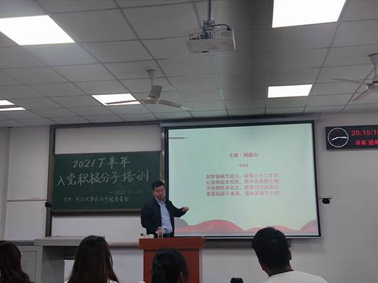 (通讯员 赵星雨)秋去冬来南飞雁,资环学子心向党。为进一步做好资源与环境学院党员发展工作,加强对入党积极分子的教育和培养,引导其提高思想觉悟,确保发展新党员质量。11月11日19:00,资环学院2021年下半年入党积极分子培训于A教210举行,本次入党积极分子培训由资环学院党委书记张科主讲,共95余名入党积极分子到场参加学习。
