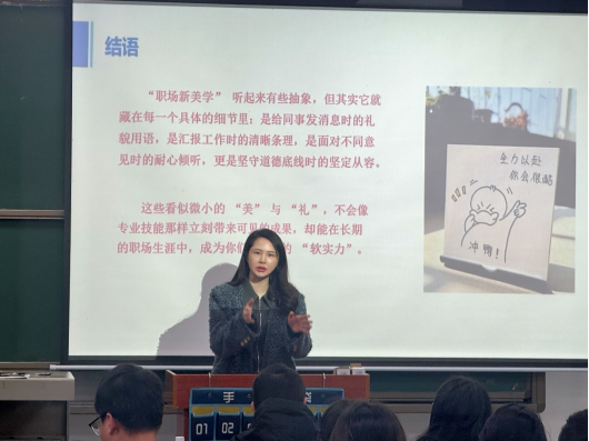 刘晓老师围绕“职场新美学”核心理念,从职业形象系统塑造、职场沟通礼仪准则、职业道德深层践行等多个维度进行深入解析,他巧妙地将外在的礼仪规范与诚信、责任、协作等职场核心美德的内涵相串联,并结合自身多年深耕行业的实践经验,生动阐释了“以礼行事”对职业发展的决定性作用。整场讲座内容既有理论高度,又极具实践指导意义,精准地弥补了研究生们在职业素养认知方面的薄弱环节,为同学们带来了一场思想与知识的盛宴。