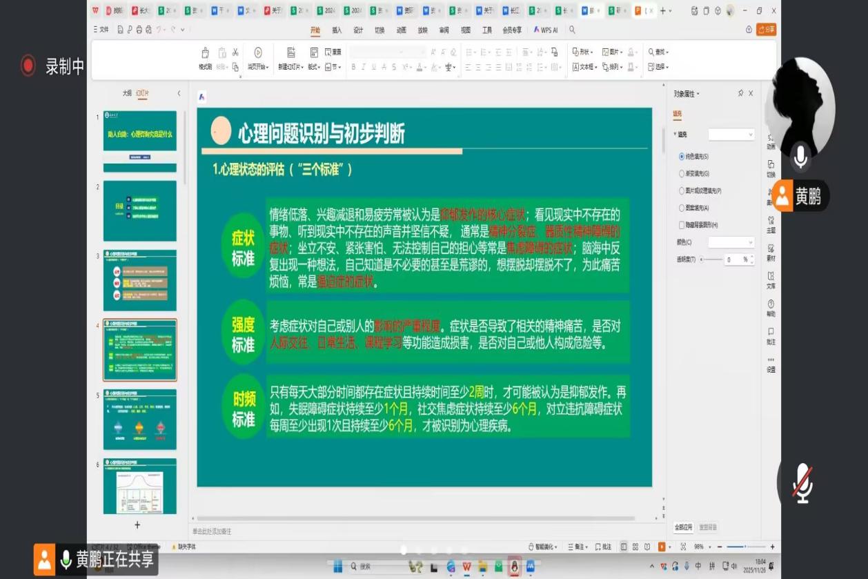 (通讯员 李豫 图/文)为帮助25级新生心育骨干精准识别心理问题、掌握心理咨询核心知识,筑牢校园心理健康防线,11月25日19:00,古天乐代言太阳集团网址采用“线下+线上”双线并行模式,同步举办25级新生心育骨干专题培训。本次培训以“助人自助:心理咨询究竟是什么”为核心主题,本科生专场在荆州校区线下开展,面向25级本科新生心育骨干;研究生专场通过线上会议平台同步推进,覆盖25级研究生心育骨干,辅导员郭政、黄鹏分别担任本研专场主讲人。 本科新生专场中,郭政老师聚焦本科生校园适应、学业压力、人际交往等高频心理困扰,展开针对性授课。他以“三把尺子”“三个标准”为核心,结合具体案例拆解抑郁、焦虑、社交恐惧等常见心理问题的典型表现,指导骨干们从情感、生理、行为维度快速识别身边同学的心理困扰。同时,郭政老师详细澄清了“心理咨询就是聊天”“只有患病才需咨询”等认知误区,演示了“今日校园”APP心理咨询预约流程,强调了咨询基本设置与保密原则,并通过互动模拟让骨干们体验简单的情绪疏导技巧,强化实操应用能力。现场骨干们专注记录要点,积极参与互动,学习氛围浓厚。 研究生专场在线上同步进行,黄鹏老师围绕研究生阶段科研压力、学术焦虑、职业规划等核心议题,系统讲解了心理咨询与心理治疗的区别、精神科诊疗与心理咨询的协同关系。他通过表格清晰呈现社会工作者、心理咨询师、精神科医师的职业分工,以“溺水者比喻”生动阐释心理咨询师的角色定位,并针对研究生可能面临的长期科研压力、学术挫折、人际关系淡化等问题,分享了心理支持的有效路径与沟通技巧。 线上互动环节,骨干们围绕“科研瓶颈期的情绪调节”“学术团队人际磨合”“如何引导同学正确看待心理治疗”等问题踊跃提问,黄鹏老师结合专业知识与实际案例逐一细致解答,现场氛围热烈。 培训尾声,郭政老师在线下主会场、黄鹏老师在线上分别作总结。两位老师均强调,心育骨干是校园心理健康防护网的关键力量,肩负着关注同学心理状态、传递心理支持的重要责任。希望全体骨干将本次培训所学知识转化为实际行动,精准识别身边同学的心理需求,主动提供力所能及的帮助,同时熟练运用校园心理服务资源,引导有需要的同学科学求助。
