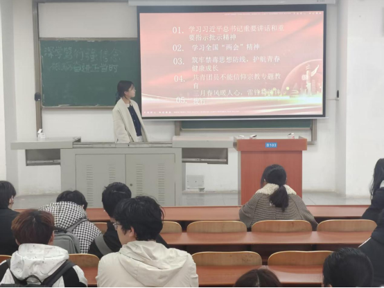 在纪律与安全教育环节,学院开展法治与政治纪律专题教育。各支部结合《禁毒法》普及禁毒知识,引导学生认清毒品危害,增强识毒、防毒、拒毒意识;同时重申共青团员不得信仰宗教的政治纪律,明确反对宗教渗透,进一步强化团员政治意识、规矩意识与组织纪律性。