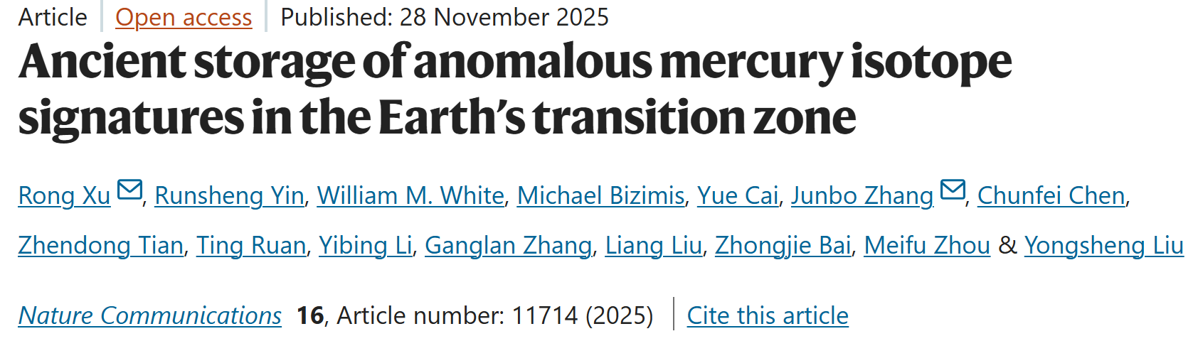 Authors: Rong Xu (徐荣)*, Runsheng Yin (尹润生), William M. White, Michael Bizimis, Yue Cai (蔡悦), Jun-Bo Zhang (张军波)*, Chunfei Chen (陈春飞), Zhendong Tian (田振东), Ting Ruan (阮婷), Yibing Li (李仪兵), Ganglan Zhang (张岗岚), Liang Liu (刘亮), Zhongjie Bai (柏中杰), Meifu Zhou (周美夫) & Yongsheng Liu (刘勇胜)