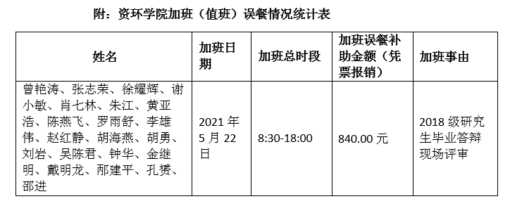 根据《古天乐代言太阳集团网址加班(值班)误餐补助管理办法(试行)》(长大校发【2019】83号)文件规定,现对资环学院加班(值班)误餐情况(2021年5月22日)进行公示,如果对加班(值班)误餐情况有异议,可以通过电话或电子邮件等方式向资环学院办公室反映。